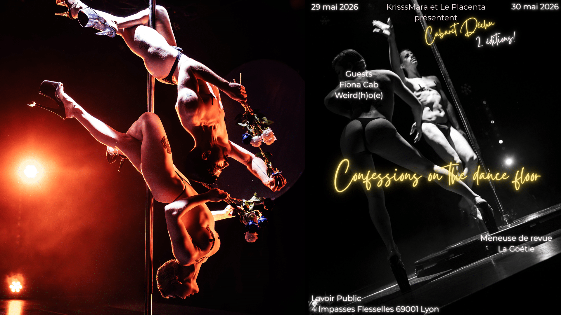 Pour cette 7ème édition du Cabaret Déchu, Krisss Mara & Le Placenta invitent de nouveaux.elles performer.uses à venir envoûter le public autour d’une barre de pole dance.