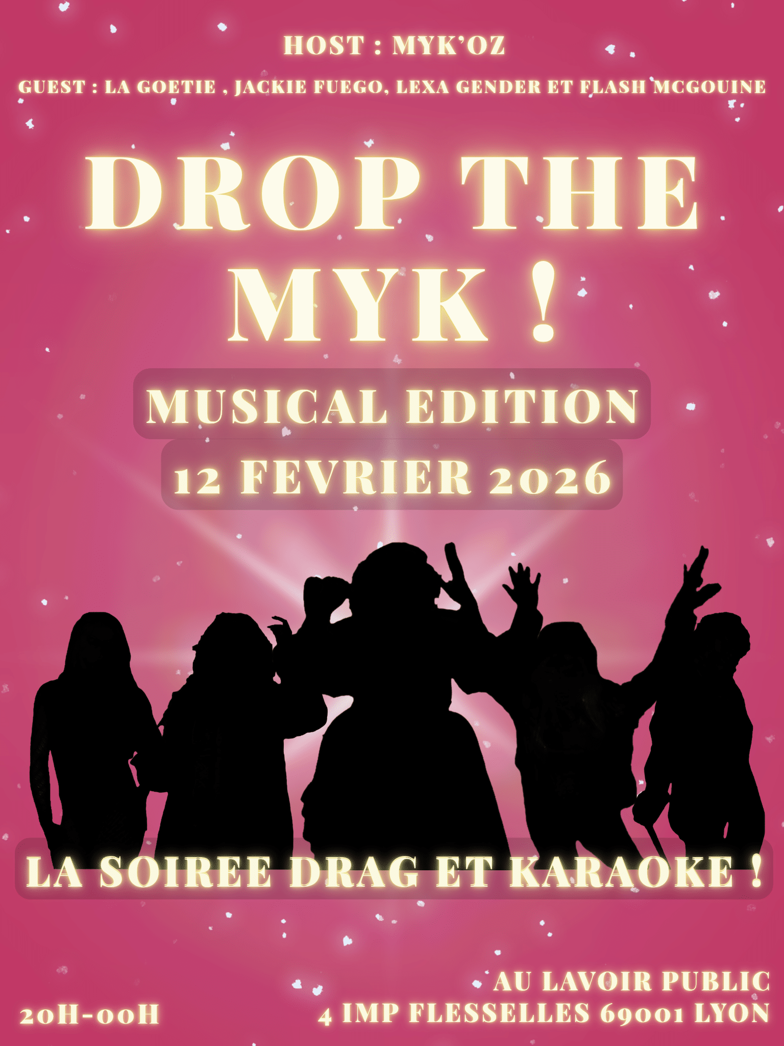 « Préparez-vous pour une soirée unique où se mêlent performances drag chantées et karaoké ouvert au public ! Une occasion parfaite pour libérer votre voix et partager la scène avec nous, les artistes. Bienvenue à Drop the Myk ! »