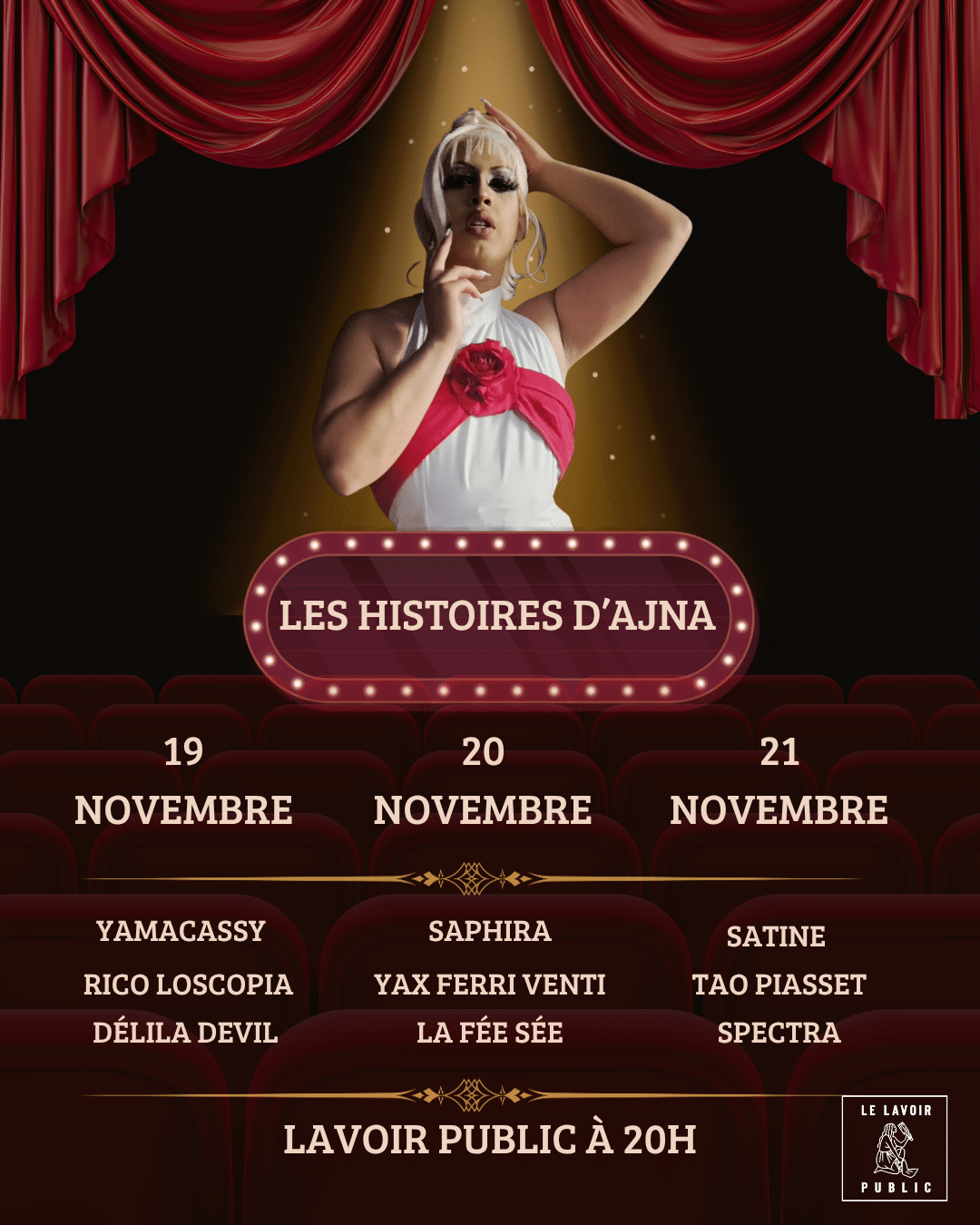 Ajna reprend un conte, un mythe ou crée une histoire pour la soirée. Elle invite 2 à 3 invité(e)s qui incarneront des personnages de cette histoire. Ajna narre l’histoire et également les dialogues en changeant de voix. Les artistes, quant à elleux, ne connaissent ni les dialogues, ni le déroulé de l’histoire. C’est un exercice d’impro pour les artistes. En effet, iels doivent lipsyncer sur la narration. De plus, iels découvrent l’histoire et les actions à entreprendre. Le tout sera agrémenté de performances drag (lipsync, poème, chant…) afin d’appuyer les propos de l’histoire.