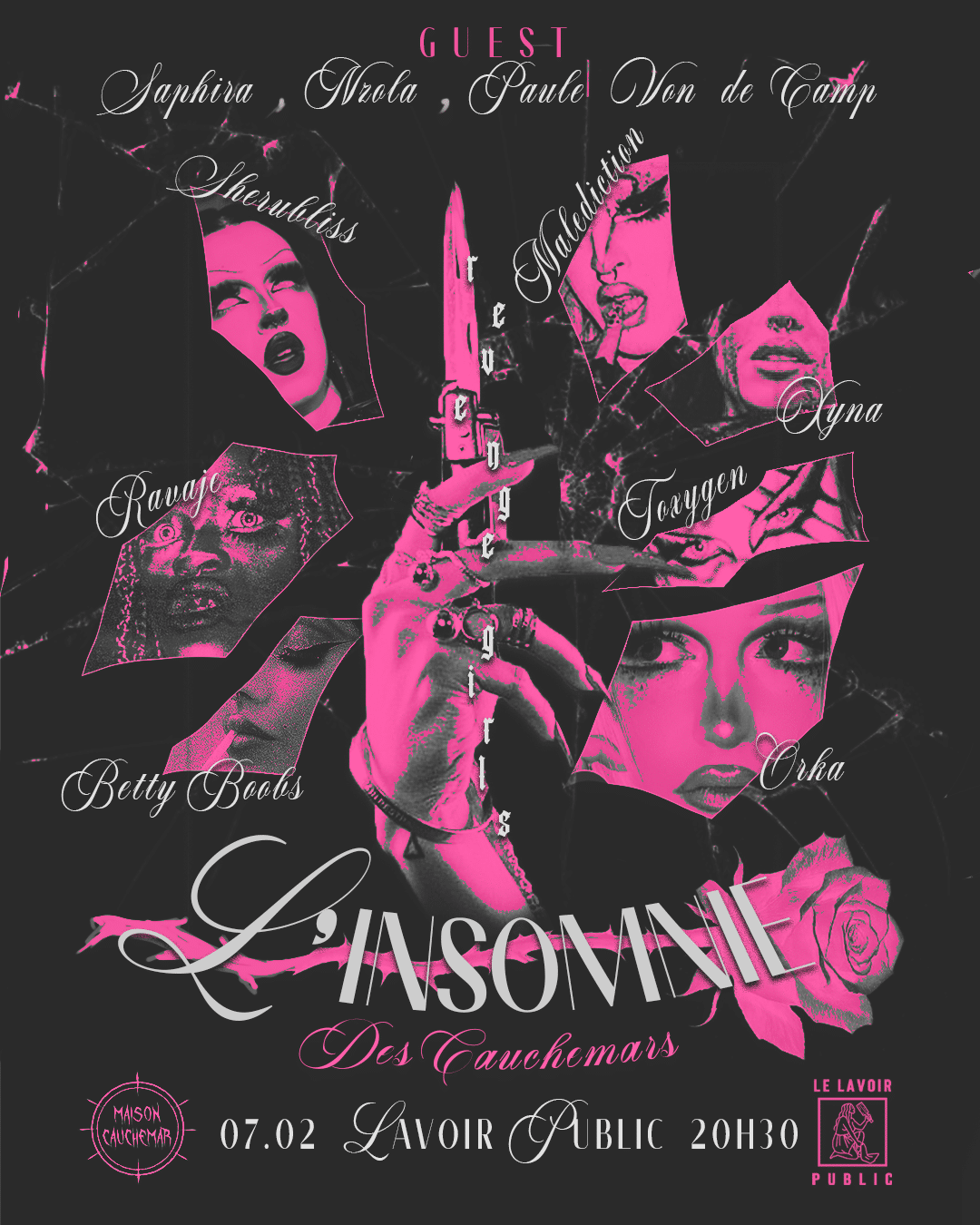Un drag show plein d’histoires avec 10 performeuses qui vont vous livrer leurs version de l’amour tragique, souvent conclus avec beaucoup de sang. La Maison Cauchemar vous invite dans une expérience immersive, le lavoir se transformera en salle de bal maccabre et la soirée sera animée par Ravaje et Malédiction qui feront office de narratrice de ces récits passionnels.