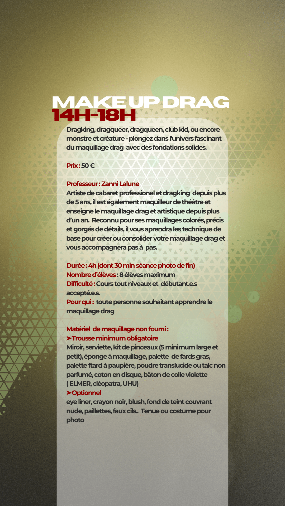 Pour qui : toute personne souhaitant apprendre le maquillage drag