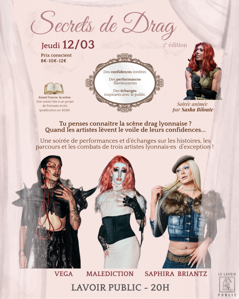 Secrets de Drag est une soirée hybride, entre drag show et entretien sociologique, où la parole devient un art et la scène un lieu de confidences. Pour cette deuxième édition, trois artistes lyonnais·es d’exception – Malédiction, Saphira Briantz et Vega – révèlent des fragments de leurs histoires ainsi que leurs regards sur la scène locale, entre confidences choisies et performances inspirantes. Le public est invité à poser des questions aux artistes et à échanger avec elleux. Un rendez-vous sensible et un format inédit, à la fois intime et collectif, laissant entrevoir la force et la résilience des parcours queers.